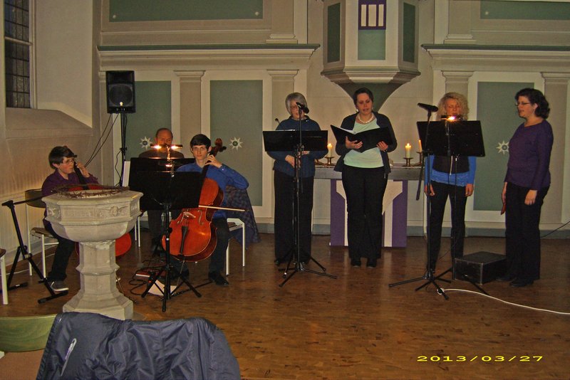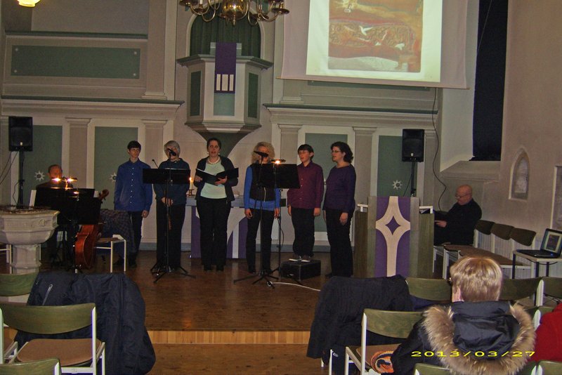 Unter der bewährten Leitung von Kantor Klaus Heuer sangen Caroline Bone, Erik, Fynn und Sabine Konscholke, Christina Vornkahl und Helga Zimmermann, begleitet am Klavier durch Klaus Heuer und teilweise durch Erik und Fynn Konscholke am Cello. Die Besucher dieser Andacht waren tief berührt von den Bildern, Texten und musikalischen Darbietungen.