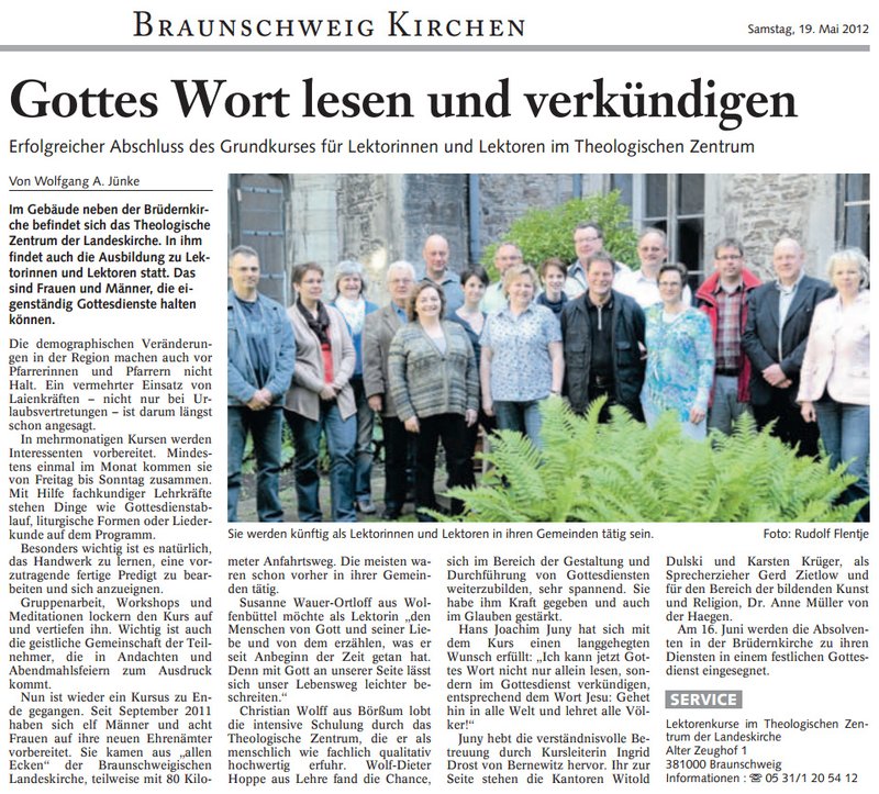 In einem Monat werden aus dem hiesigen Kirchenvorstand Astrid Gödecke und Christian Wolff ihre Ausbildung zur Lektorin / Lektor beenden und nach dem Abschlusskolloquium am Samstag, dem 16. Juni 2012 in einem Festgottesdienst um 15 Uhr feierlich in Braunschweig in St. Ulrici-Brüdern offiziell beauftragt und in ihr Amt eingeführt.