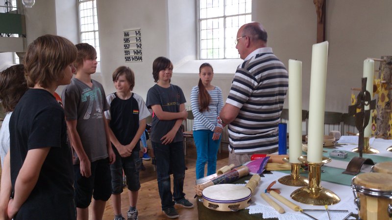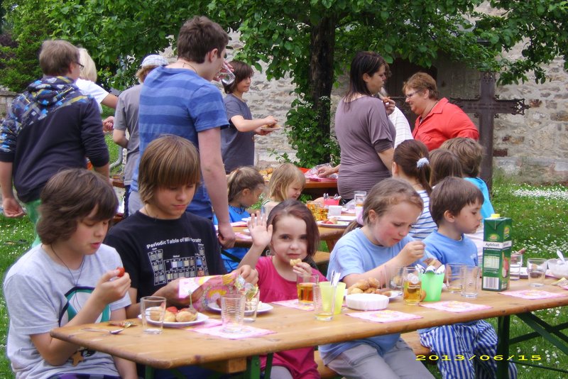 Wie immer begann die Kinderkirche mit einer Andacht in der Peter und Paul Kirche. Fast alle Kinder aber auch die Mitarbeiterinnen bekamen Trommeln und andere Instrumente, um so das Singen zu einem wirklichen Partyerlebnis zu machen. Pfarrer Fröhlich erzählte ein Gleichnis aus der Bibel, das Jesus seinen Freunden erzählt hatte, um deutlich zu machen, dass Gott uns immer wieder zum großen Fest des Glaubens einlädt. Am Ende der Andacht wurden acht Kinder, die seit vielen Jahren Mitglieder der Kinderkirche waren, feierlich verabschiedet. Pfarrer Fröhlich überreichte ihnen als Erinnerung an die Kinderkirche ein kleines Holzkreuz. Er betonte, dass dieses Holzkreuz ein Zeichen dafür sei, dass Jesus als ihr Freund sie nun auch im Vorkonfirmandenunterricht begleiten wird. Abschließend sprach er ein Segensgebet für die verabschiedeten Kinder. Einige der Kinder betonten allerdings, dass sie die Kinderkirche nun doch noch nicht verlassen werden, sondern nach den Ferien als Teamer weiter dabei sein möchten. Nach der Andacht ging das Fest bei herrlichem Sommerwetter weiter. Es wurde gespielt, gegessen und getrunken. Die Mitarbeiterinnen hatten dafür ein außergewöhnliches leckeres Frühstück mit allem was Kinderherzen erfreut vorbereitet. Pfarrer Fröhlich bedankte sich ausdrücklich auch im Namen der Kinder und Eltern beim Kinderkirchenteam. Ohne dieses hervorragende Team wäre es gar nicht möglich, immer wieder ein buntes Programm für die Kinder zu gestalten. Im Juli macht die Kinderkirche Ferien. Das nächste Treffen findet dann am Samstag, 17. August wieder in der Zeit von 10-12 Uhr statt
