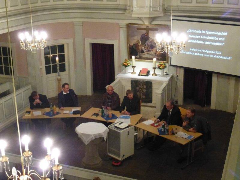 „Christsein im Spannungsfeld zwischen Feindesliebe und militärischer Intervention“ – mit diesem Thema wurde die diesjährige Predigtreihe am 29. Januar 2015 in der Gielder Kirche eröffnet. Knapp 50 Zuhörer und Zuhörerinnen folgten den Berichten und Meinungen von fünf Gästen die auf dem Podium Platz genommen hatten. Pfarrer Frank Ahlgrim begrüßte Frank Oesterhelweg MdL aus Wer-laburgdorf, Olaf Engelbrecht, ehem. Standortpfarrer aus Braunschweig, Elvin Hülser, Antikriegshaus Sievershausen aus Berlin, Bernd Müller-Keil, Flugsicherheitsoffizier aus Fassberg und Pfarrer Rolf Fröhlich aus Börßum. Die kurzen Einstiegsstatements der Podianten machten die Gäste neugierig. Es schloss sich eine sehr interessante zwei stündige Diskussion an, in der sich die Positionen der einzel-nen Gesprächsteilnehmer heraus kristallisierten. Klar wurde schnell, dass man sich als Christ zwar der Verantwortung stellen muss, in der Nachfolge Jesu zu leben, dabei aber die Problematik der unter-schiedlichen Staats- und Gesellschaftsstrukturen nicht außer Acht lassen kann und darf. Ein wichtiges Augenmerk muss dabei auf die Prävention gelegt werden, so die Ausführungen von Elvin Hülser. Als Betroffene berichteten Bernd Müller-Keil und Olaf Engelbrecht von den Problemen und Sorgen, mit denen die Soldaten bei den Einsätzen u.a. in Afghanistan zu kämpfen haben. Frank Oesterhelweg machte neben seiner ganz persönlichen Anschauung auch die Position der Politik klar und wies die Kritik zurück, dass viele Politiker sich von den deutschen Bündnispartnern sowie eigenen und Volks-interessen leiten ließen. Auf die rein theologische Grundlage unseres christlichen Glaubens, nämlich die Nachfolge Jesu bis an das Kreuz, mit allen daraus resultierenden Konsequenzen verwies Rolf Fröhlich.