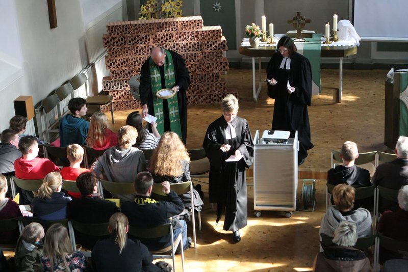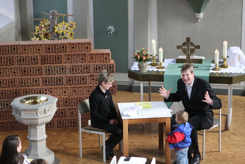 Wer sich noch bei der Begrüßung von Pfarrer Rolf Fröhlich gefragt hatte, warum er darauf hingewiesen hatte, dass auch Lachen in diesem Gottesdienst erlaubt sei, musste selbiges spätestens bei der Darbietung eines Sketches von Pfarrerin Dorothea Hahn-Pietrzynski und Pfarrer Frank Ahlgrim tun, die in einer Szene einen ehelichen Dialog um ein angeblich verschwundenes Brötchen darboten. So manche Aussage, aneinander Vorbeireden, nicht richtiges Zuhören und Missverständnisse schien eine Großzahl der Gottesdienstbesucher irgendwie wiederzuerkennen.