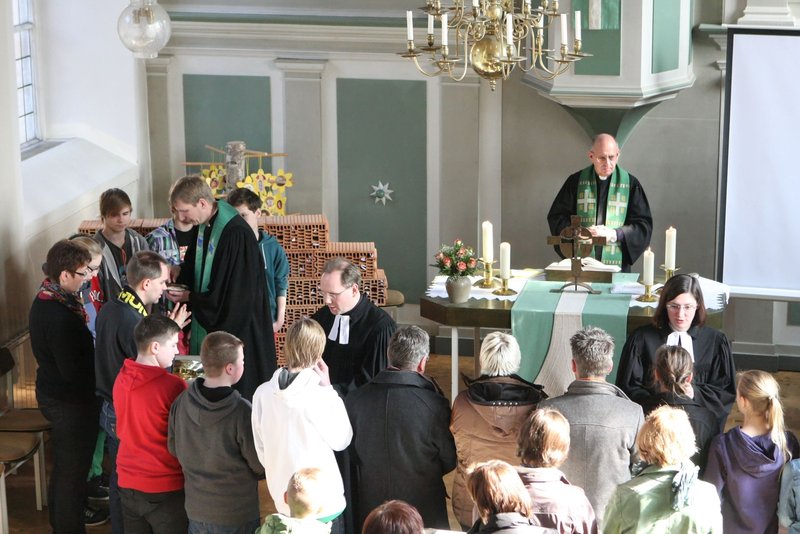 An einer in der Kirche aufgebauten „Klagemauer“ nahmen Pfarrer Frank Ahlgrim und Pfarrer Olaf Schäper die von den Gottesdienstbesuchern auf kleinen Zetteln aufgeschriebenen belastenden Gedanken in Empfang, bevor dann die Absolution erteilt wurde, um belastende Gedanken und Gefühle von der Gemeinde zu nehmen.