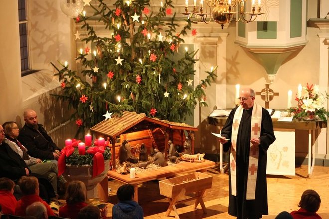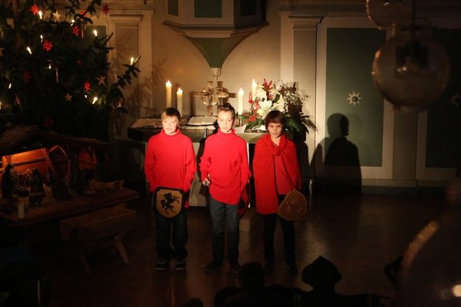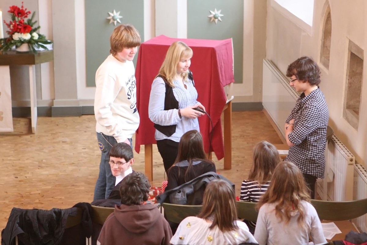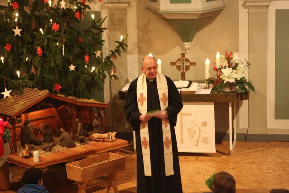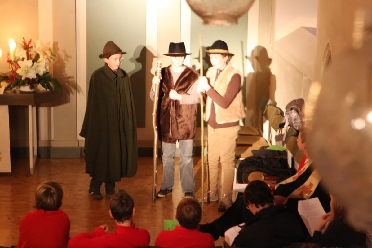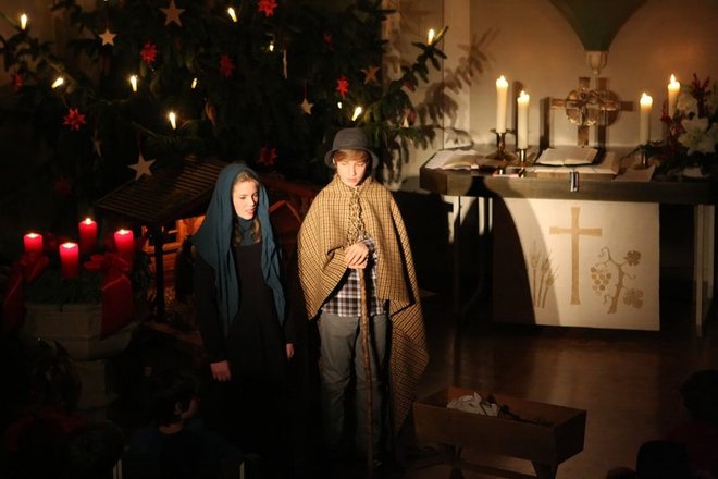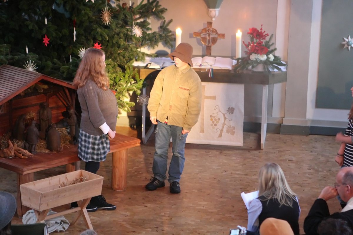Im Zentrum des Gottesdienstes stand das Krippenspiel – traditionell dargeboten von den Vorkonfirmanden. Diese hatten gemeinsam mit den Teamern eine klassische Version einstudiert und boten diese nahezu perfekt dar. Alle hatten die Worte von Pfarrer Fröhlich beherzigt und sprachen laut und deutlich, so dass auch auf den Stehplätzen im Turm die Texte zu vernehmen waren.