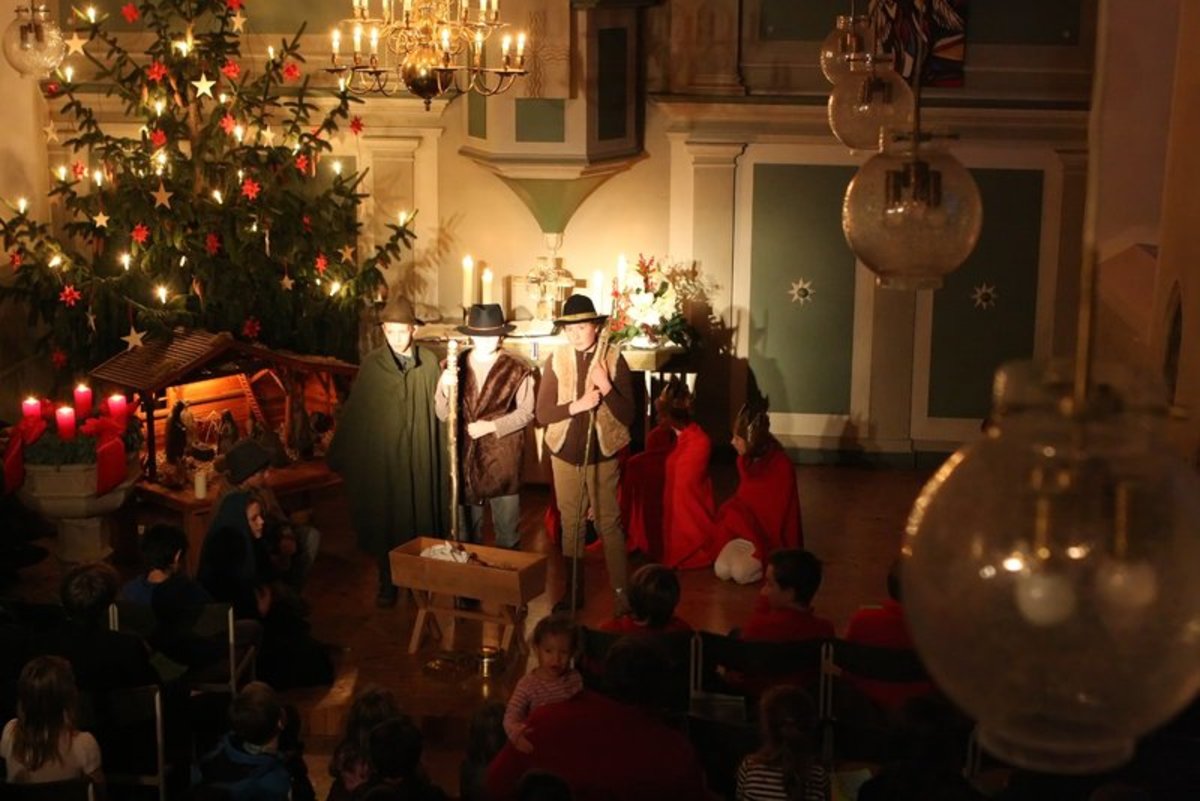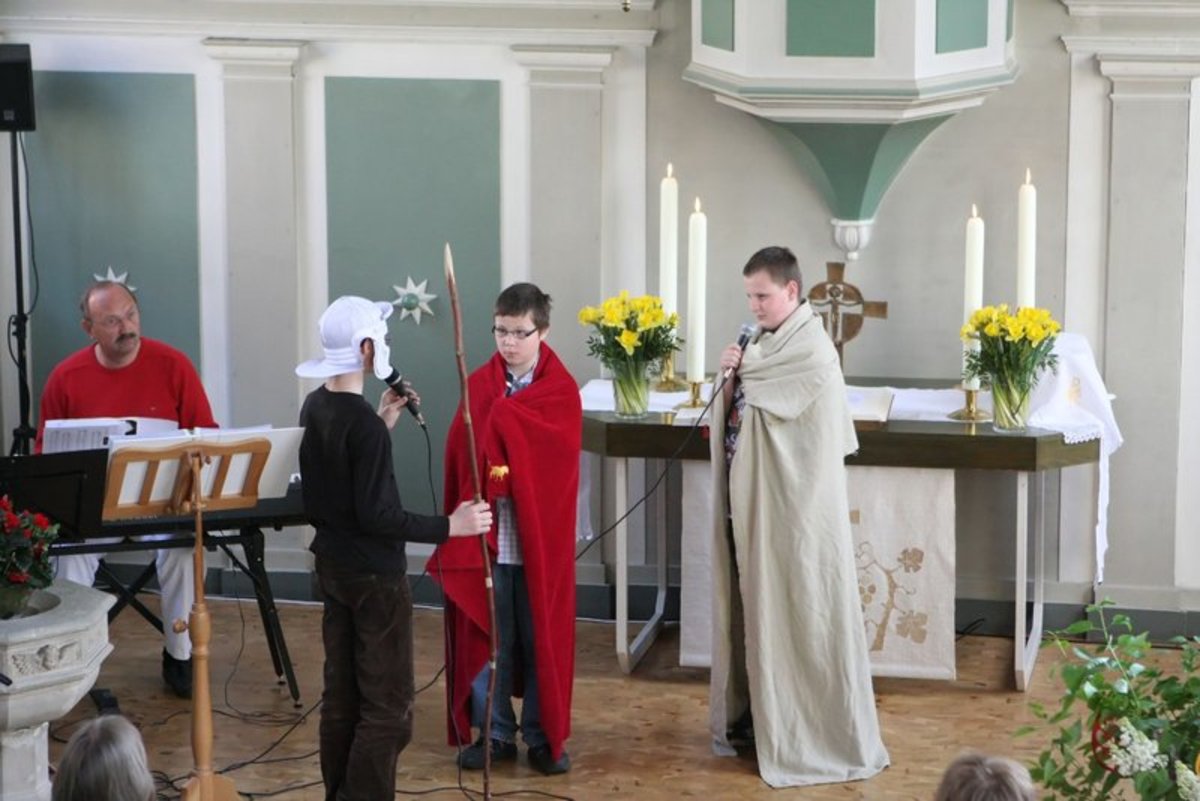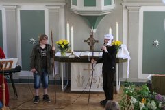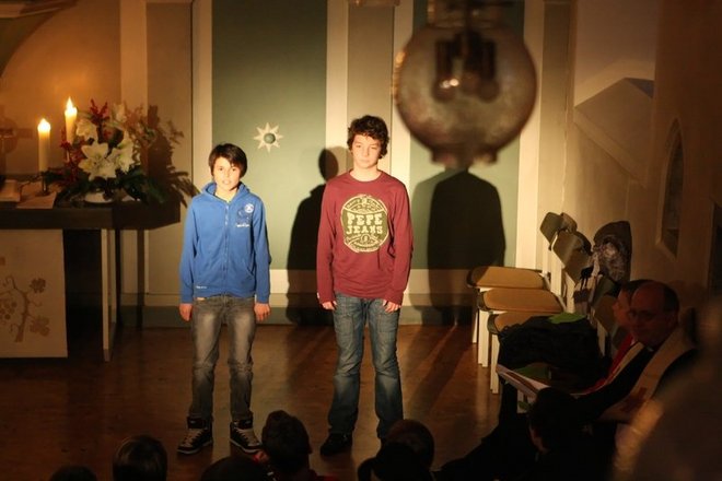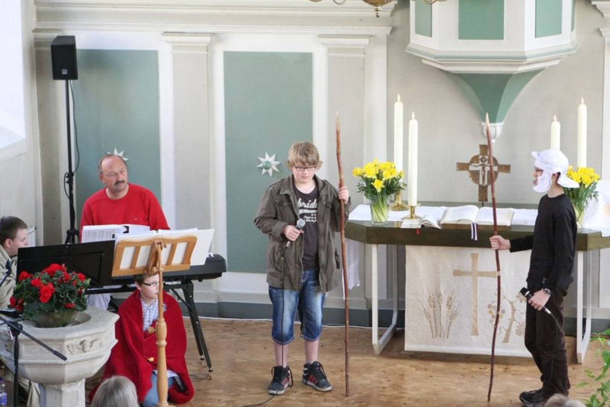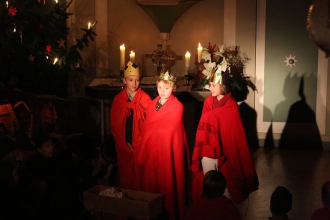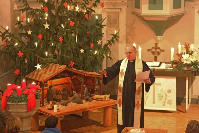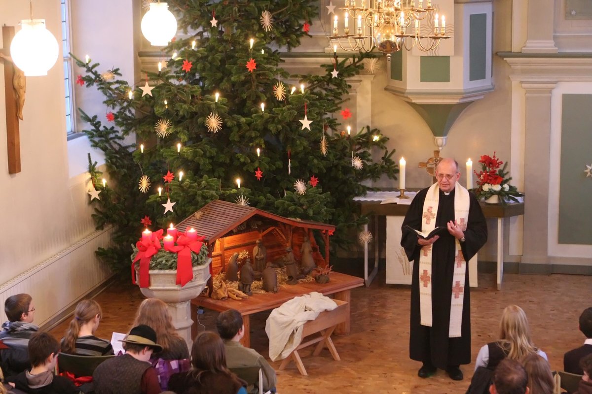 Im Zentrum des Gottesdienstes stand das Krippenspiel – traditionell dargeboten von den Vorkonfirmanden. Diese hatten gemeinsam mit den Teamern eine klassische Version einstudiert und boten diese nahezu perfekt dar. Alle hatten die Worte von Pfarrer Fröhlich beherzigt und sprachen laut und deutlich, so dass auch auf den Stehplätzen im Turm die Texte zu vernehmen waren.